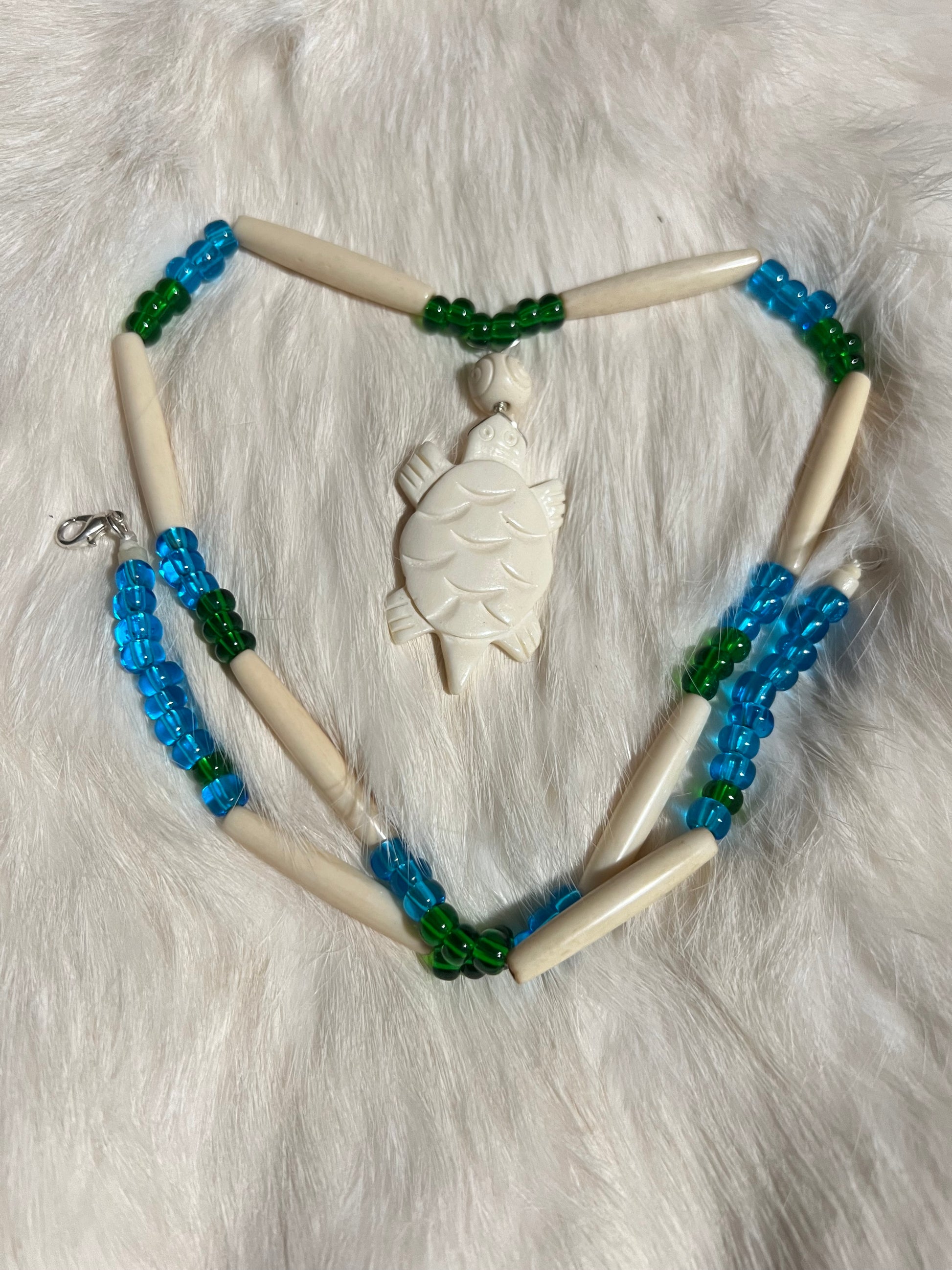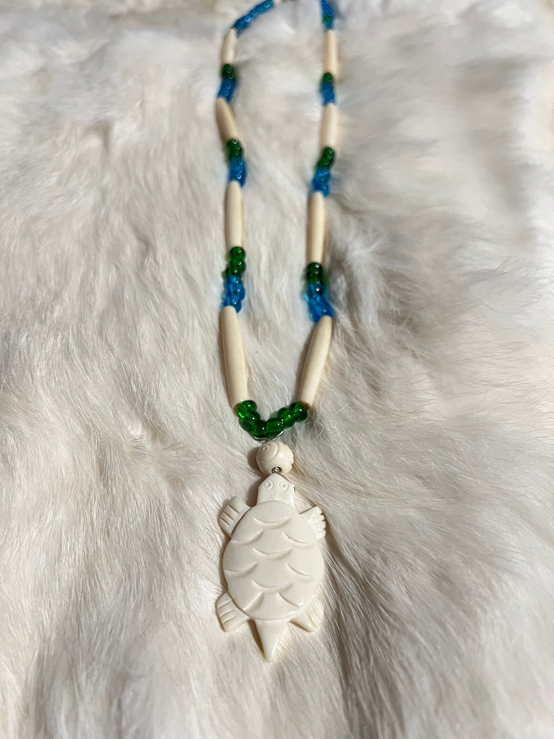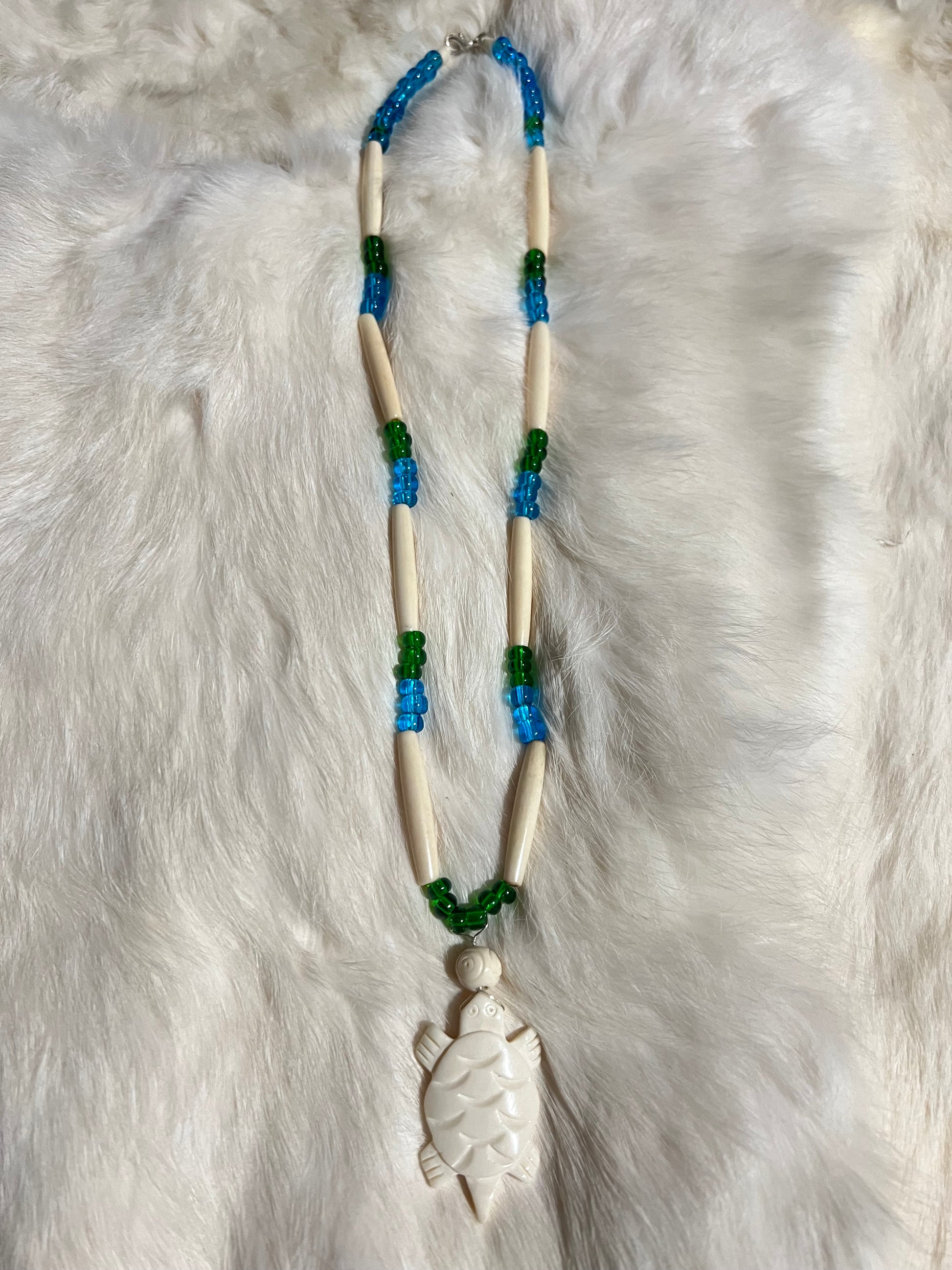 Carved bone and glass simple layering necklace depicting a sea turtle
