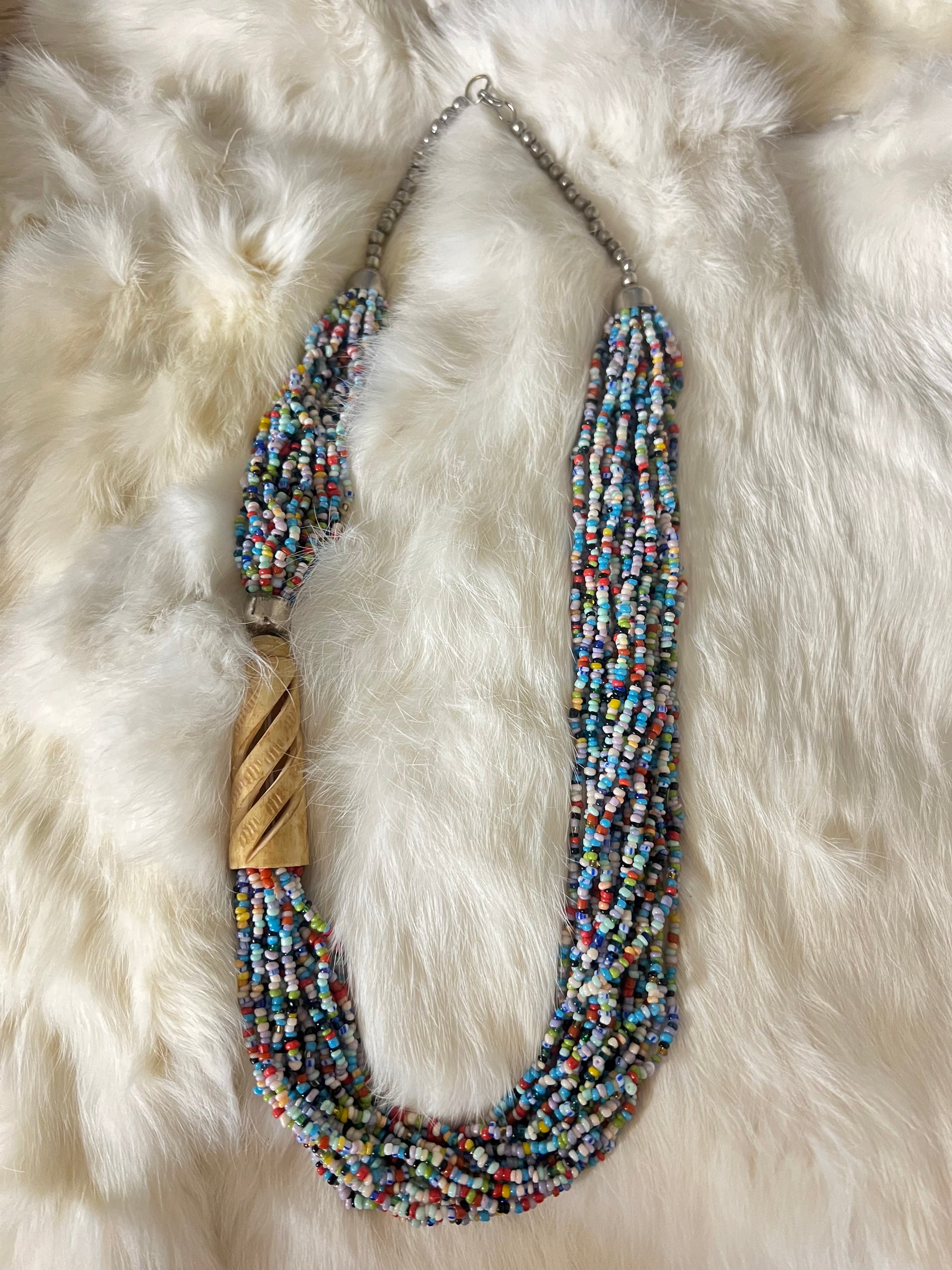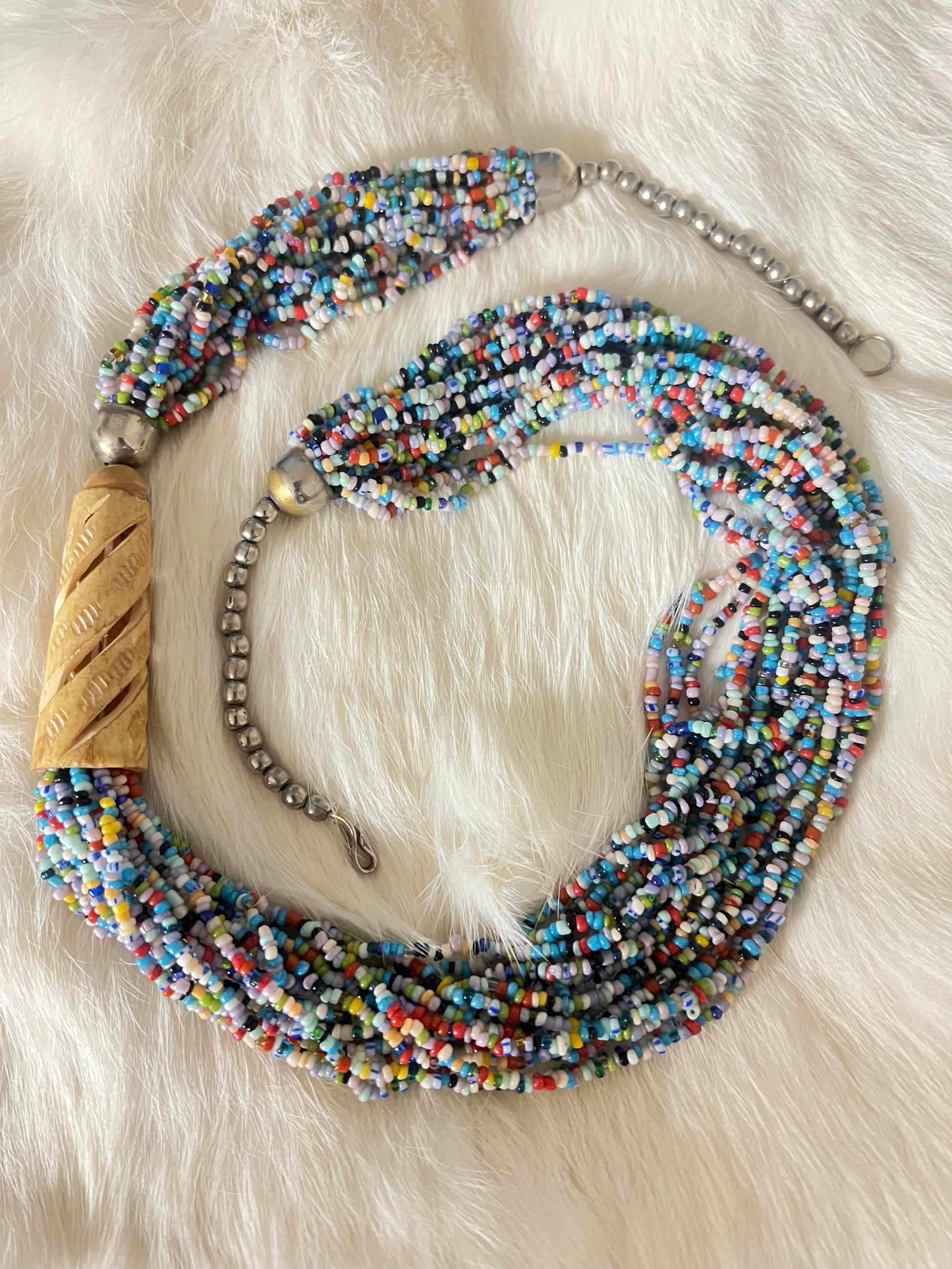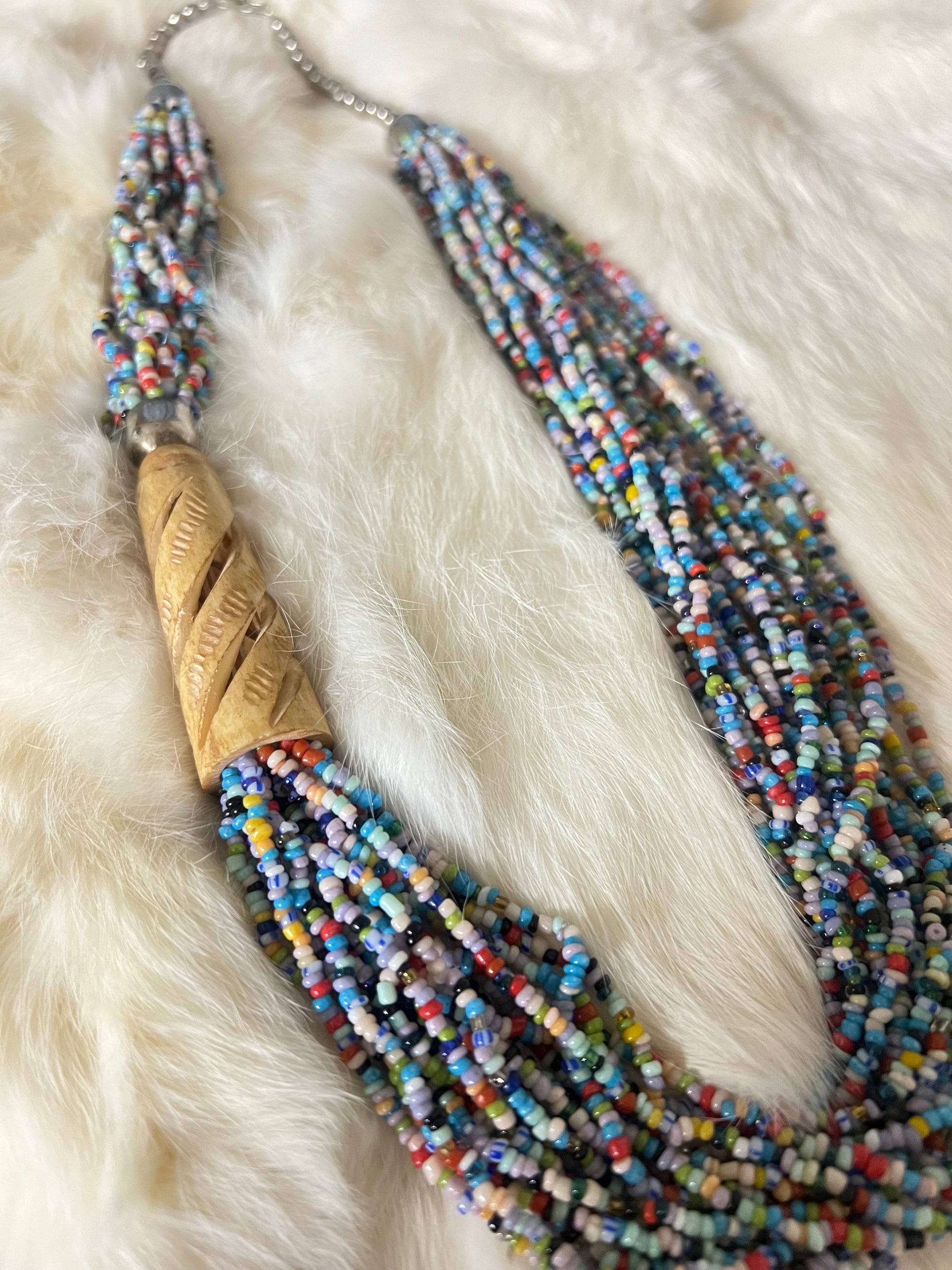 Antique carved bone pendant with layered multicolor glass and brass accents statement necklace