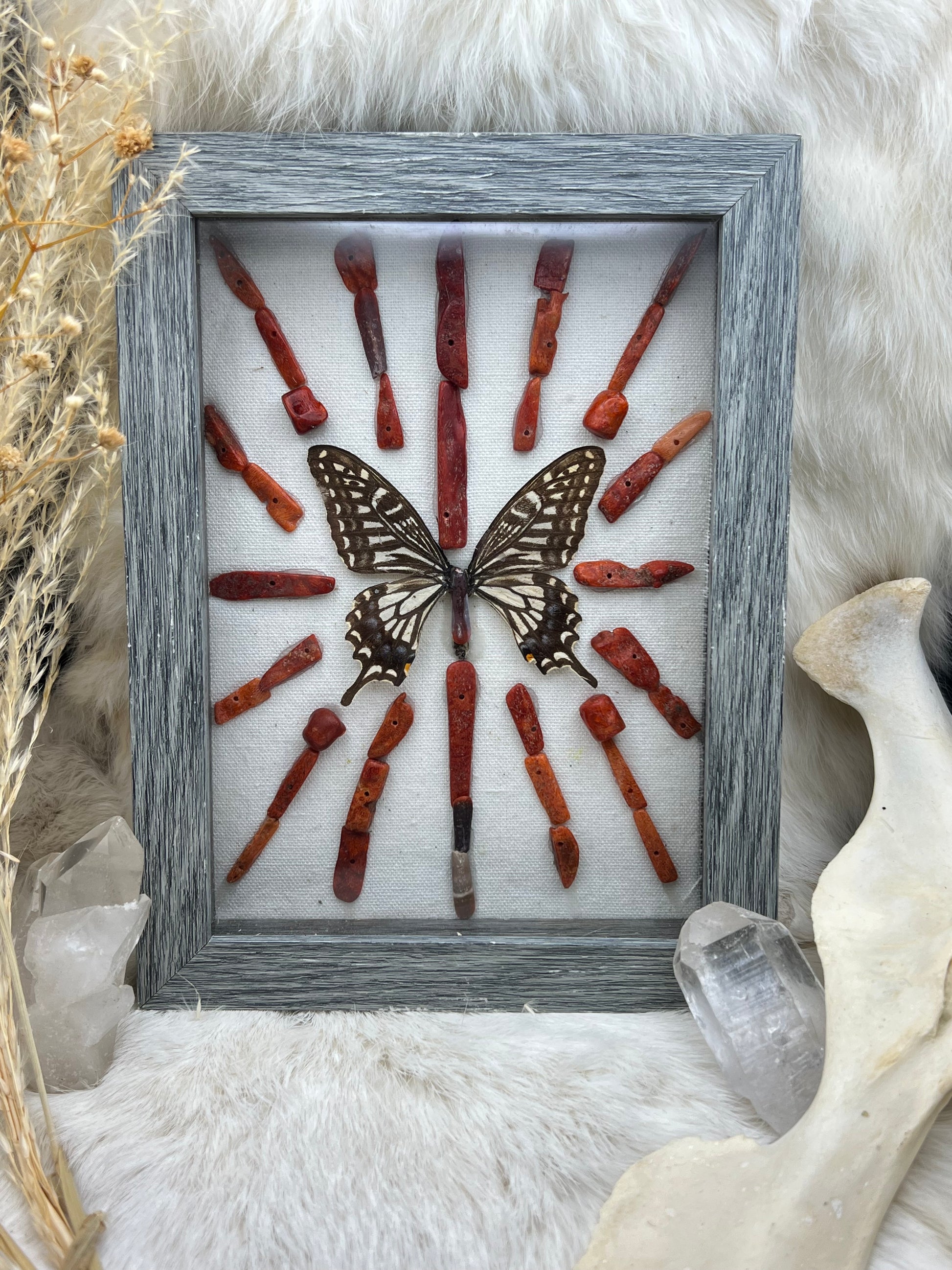 Papilio xuthus Aka yellow swallowtail butterfly. Includes red coral or jasper stones from an upcycled necklace.