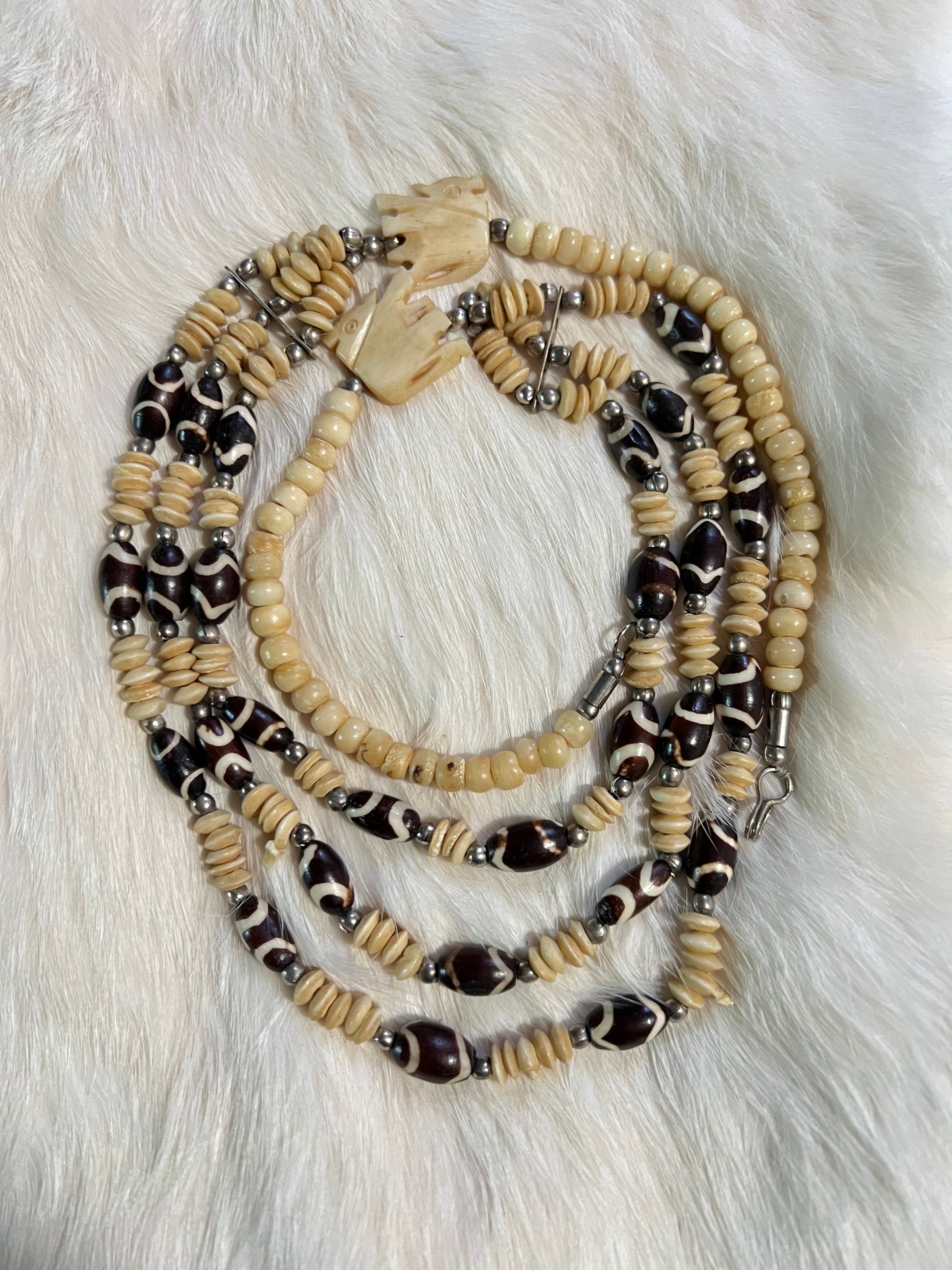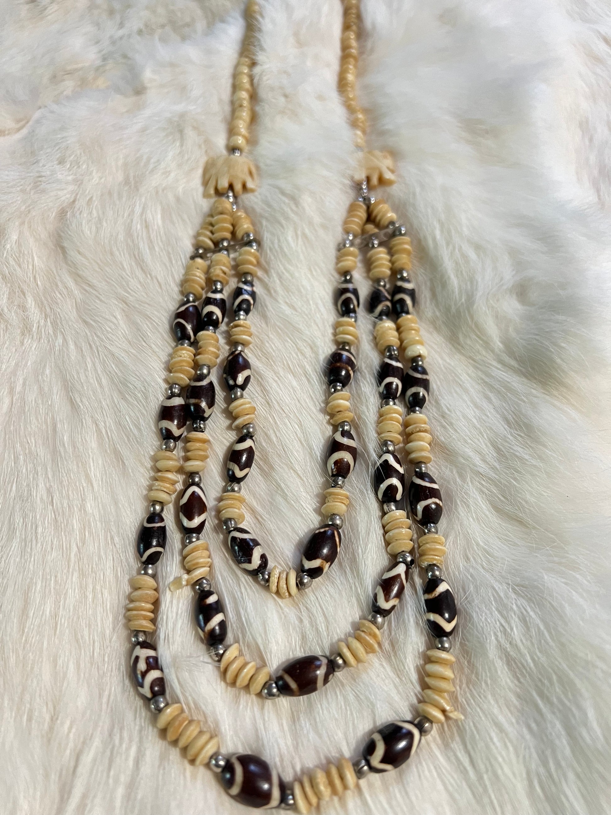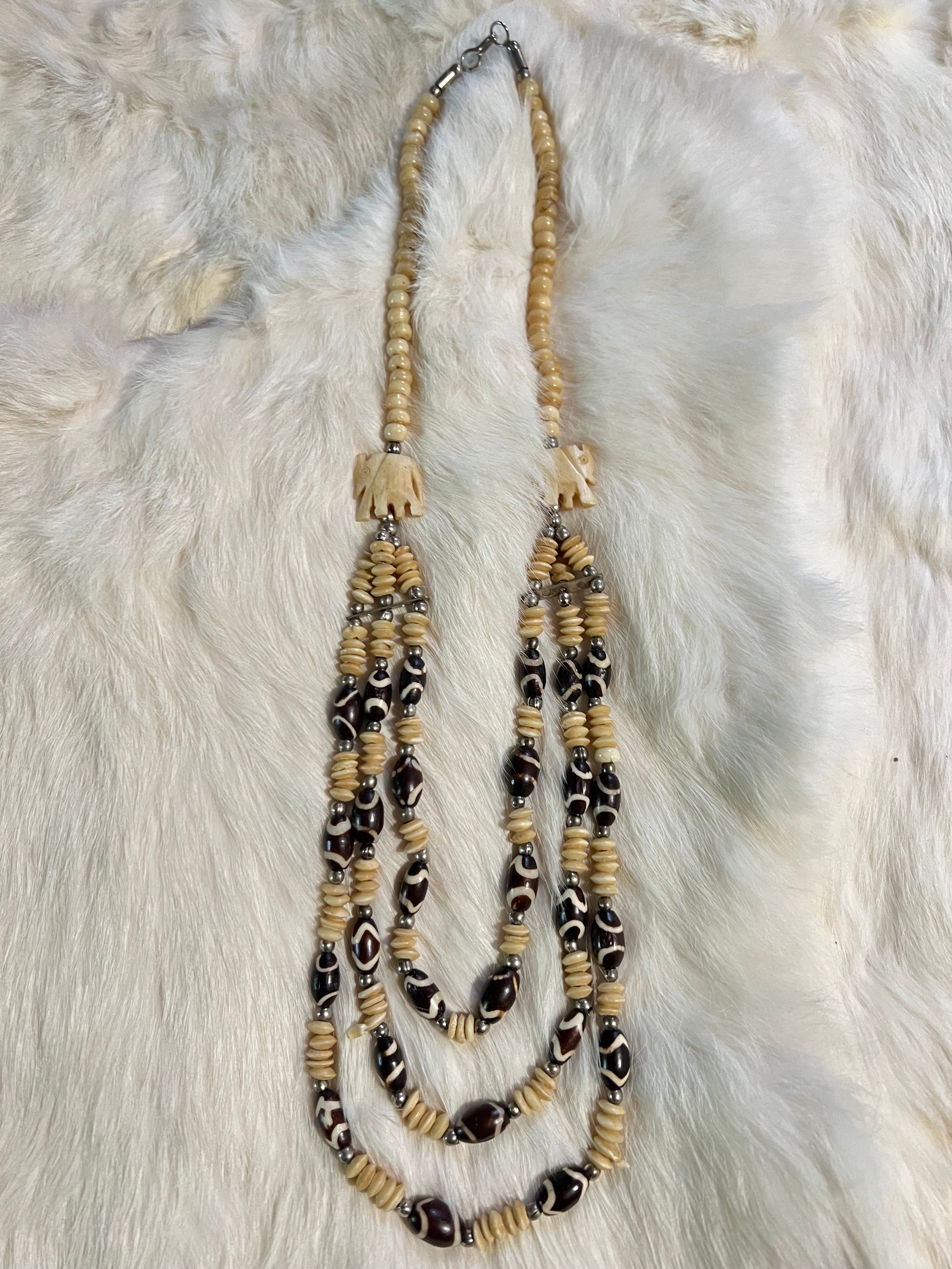 Layered bone and brass statement necklace with dyed bone and carved elephants