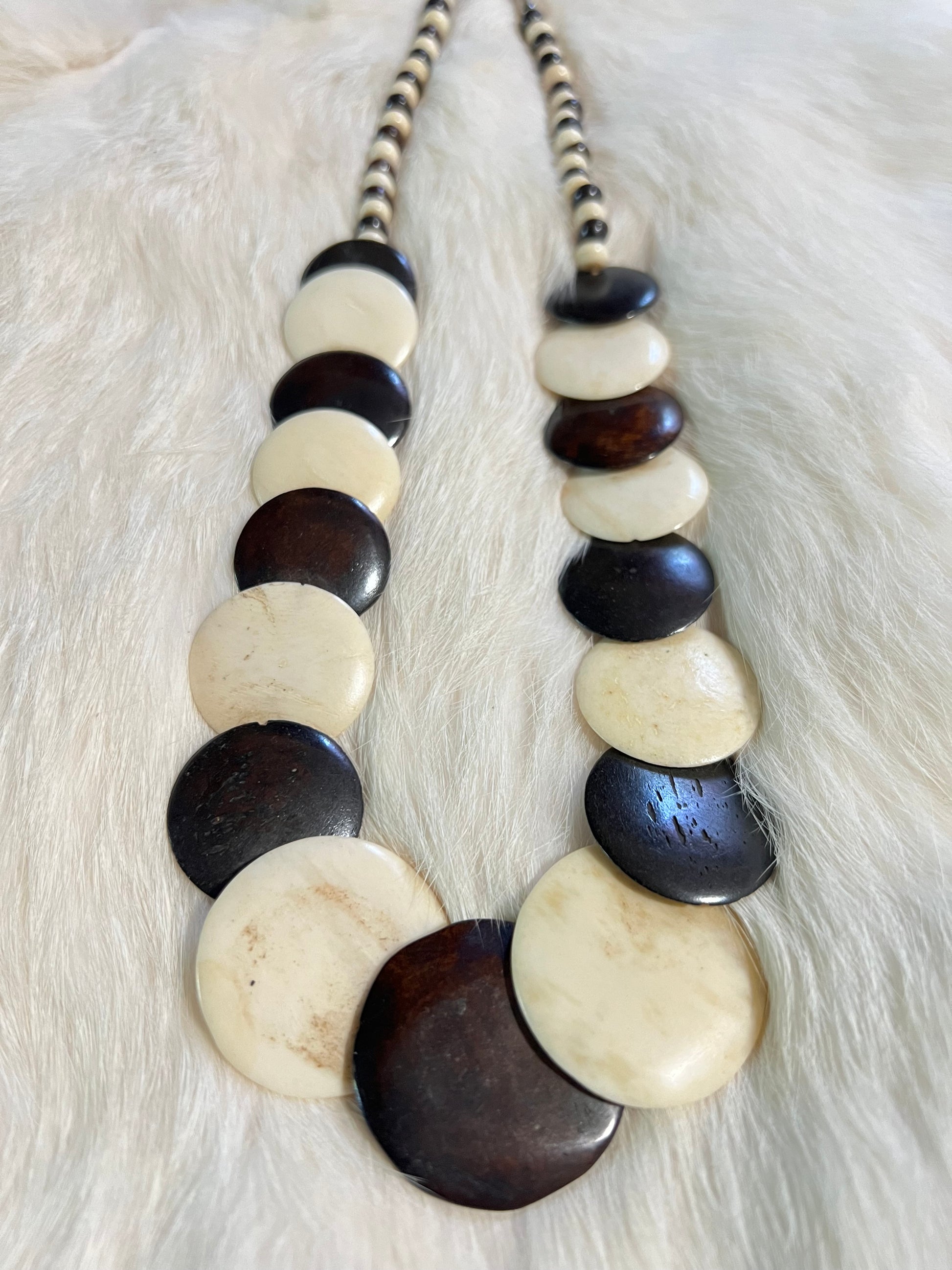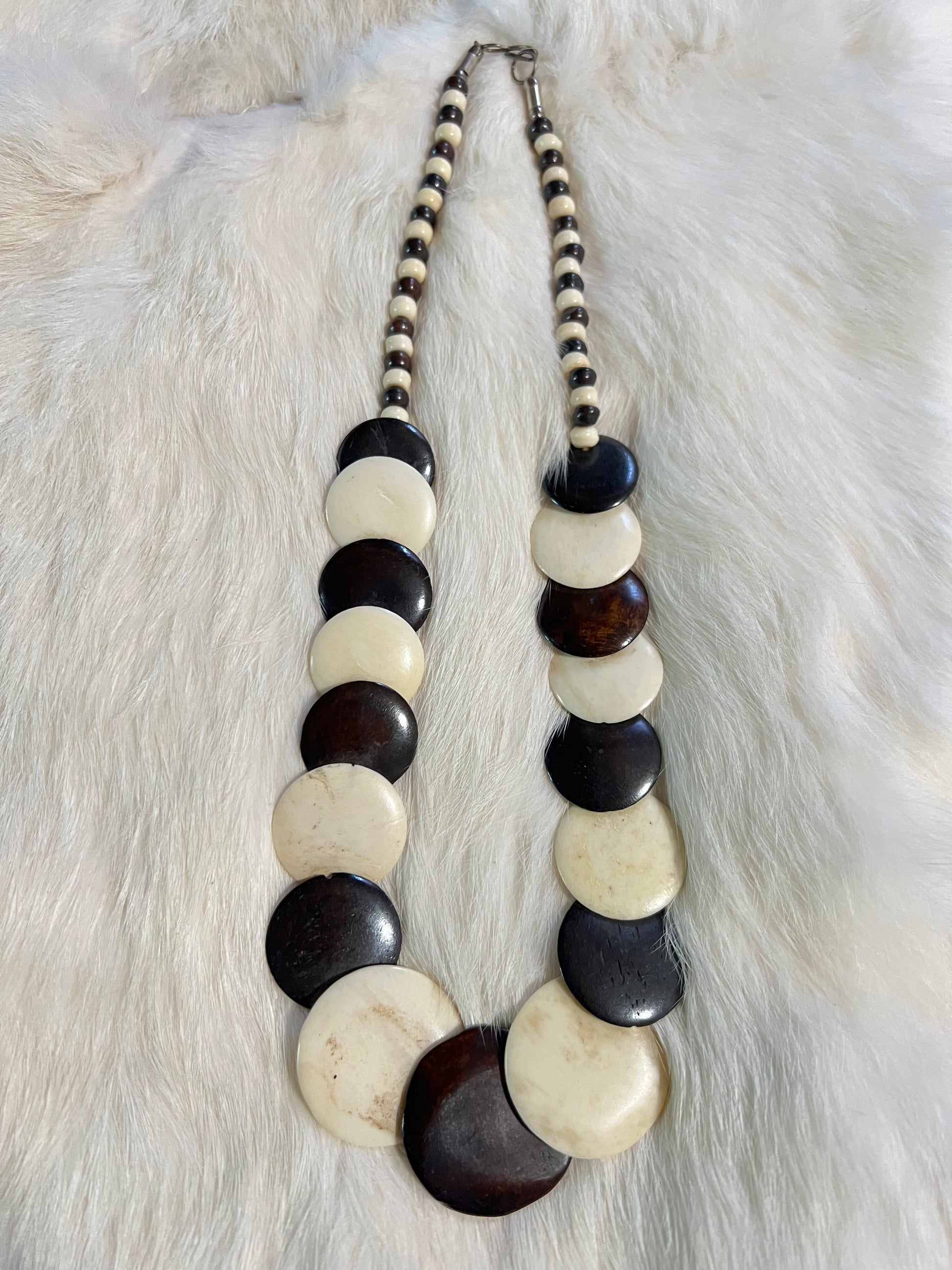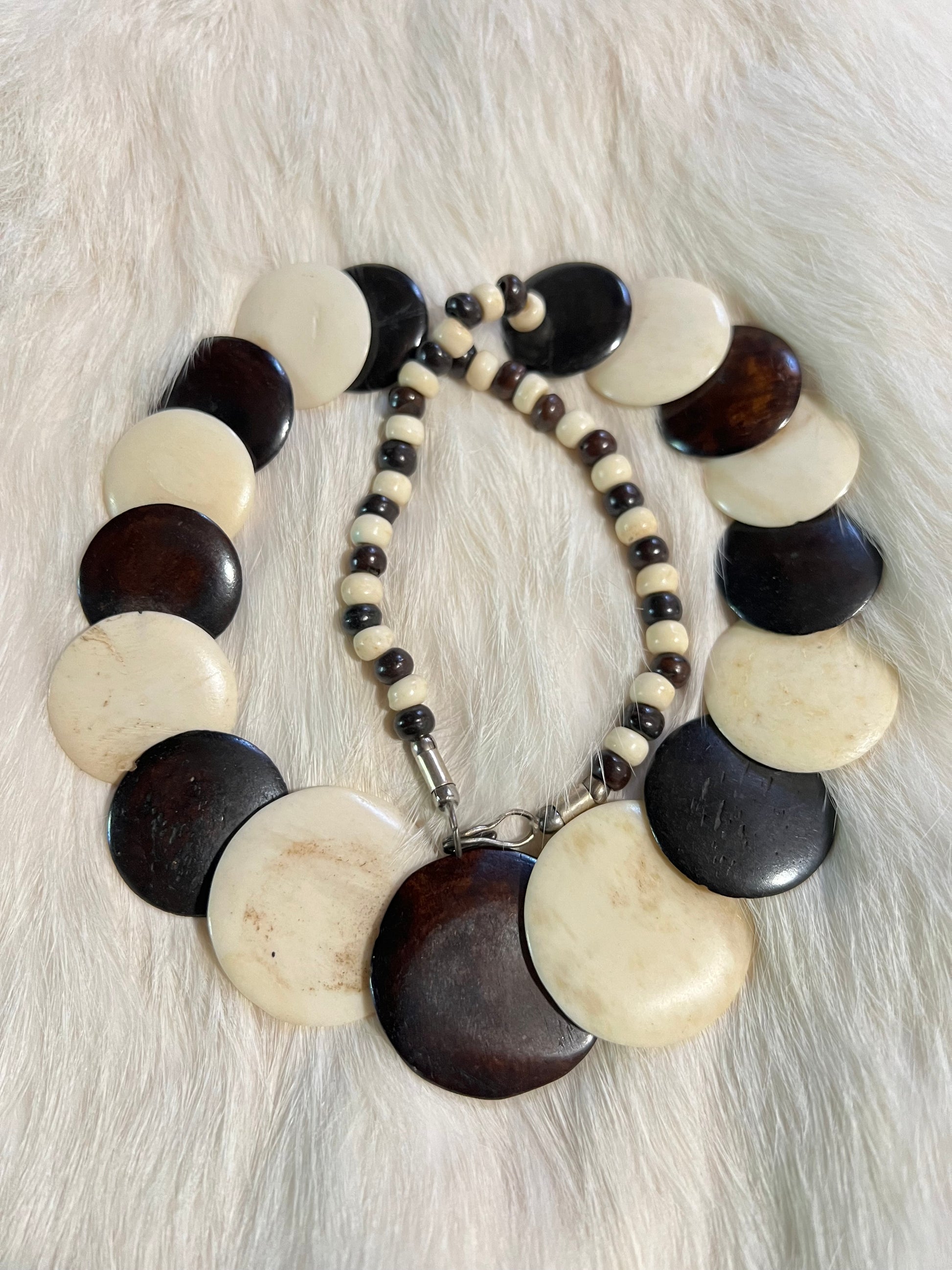Natural and dyed black bone disks with brass clasp