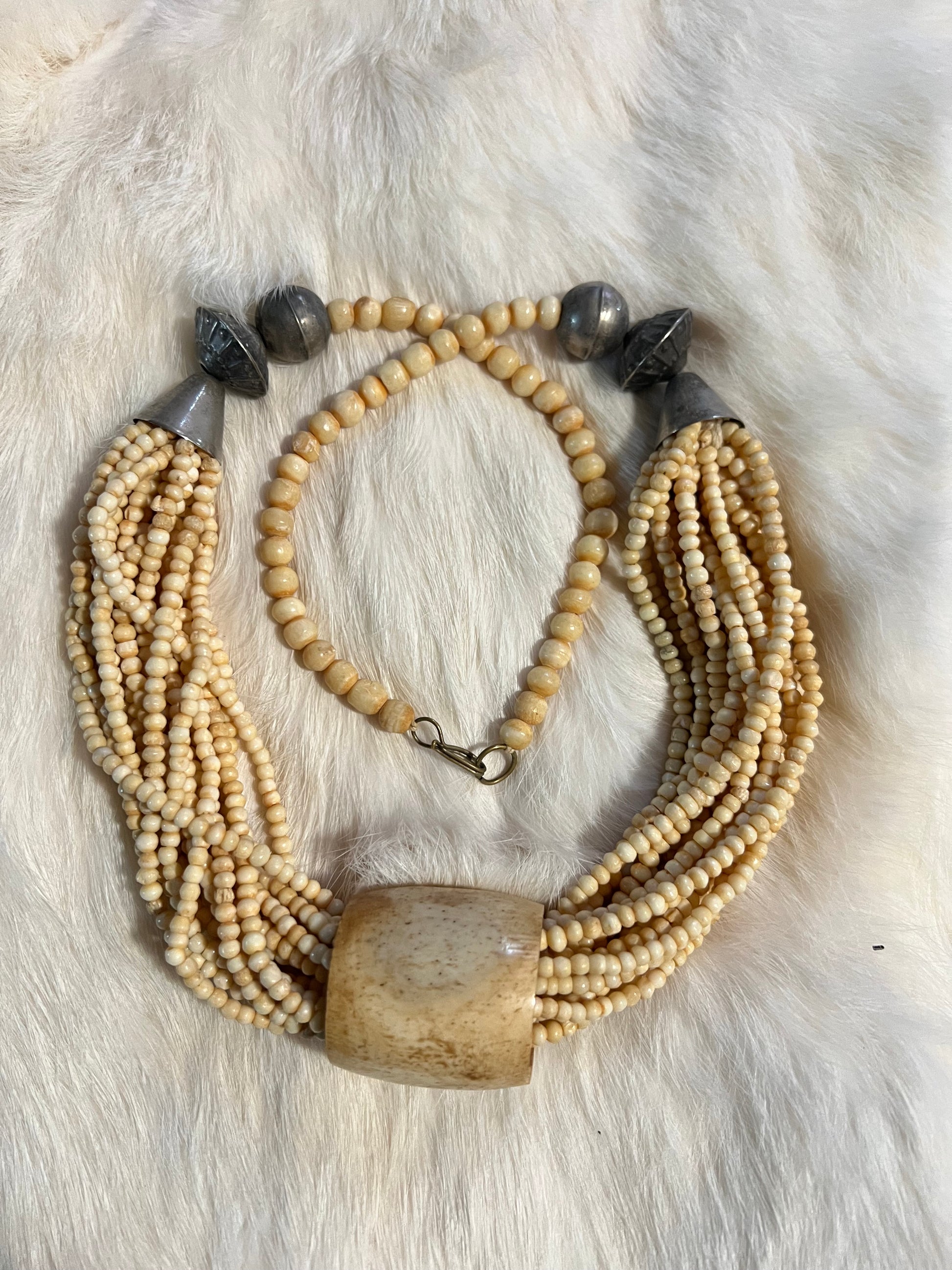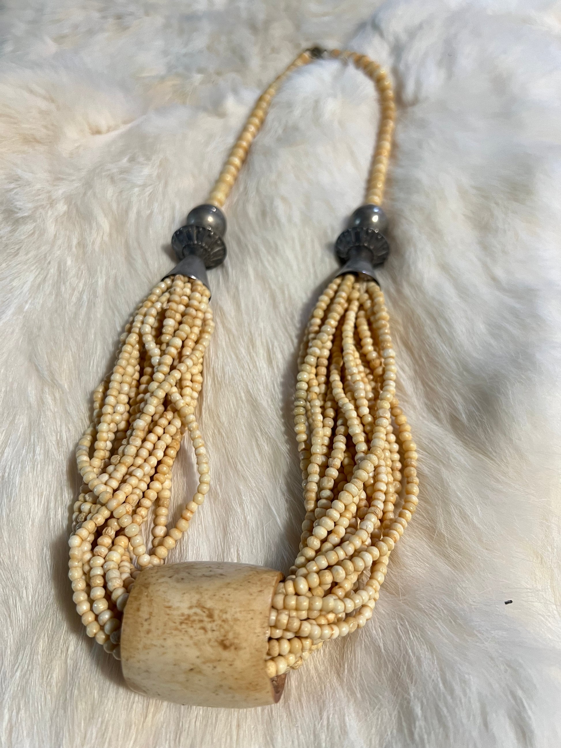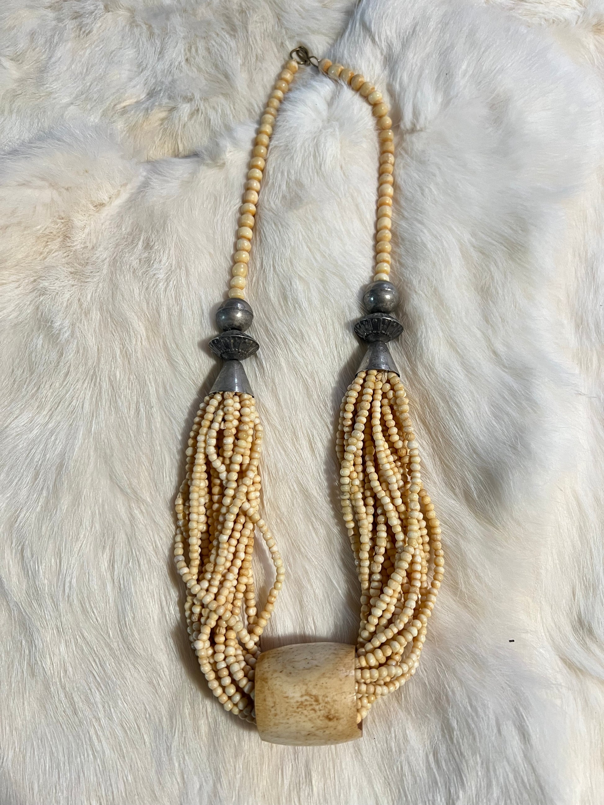 Large hollowed bone pendant with carved bone spheres and brass accents