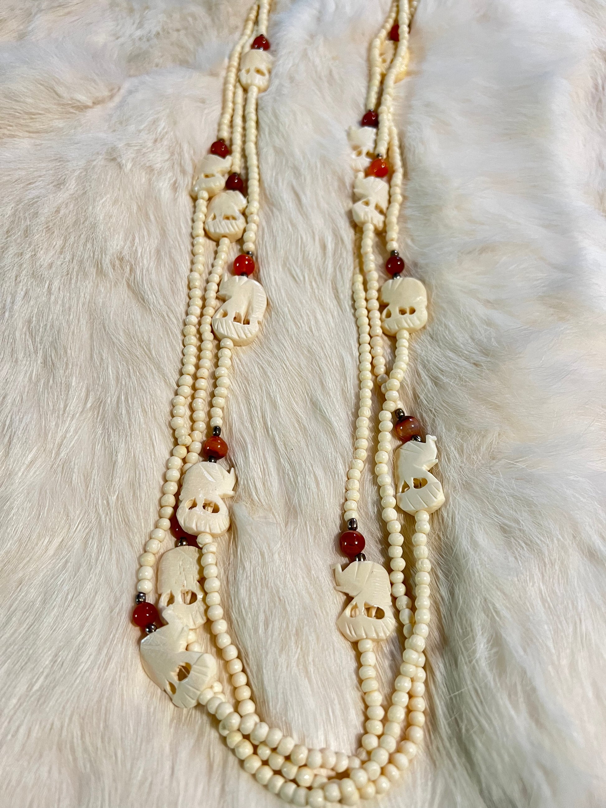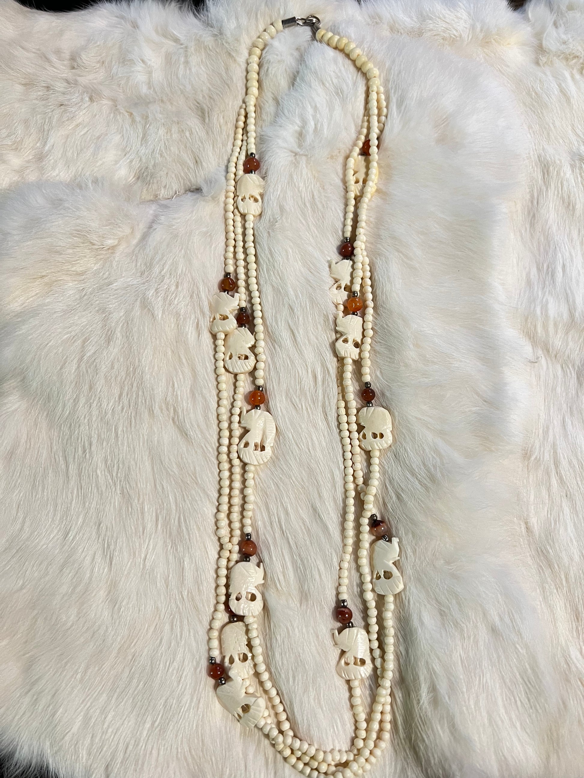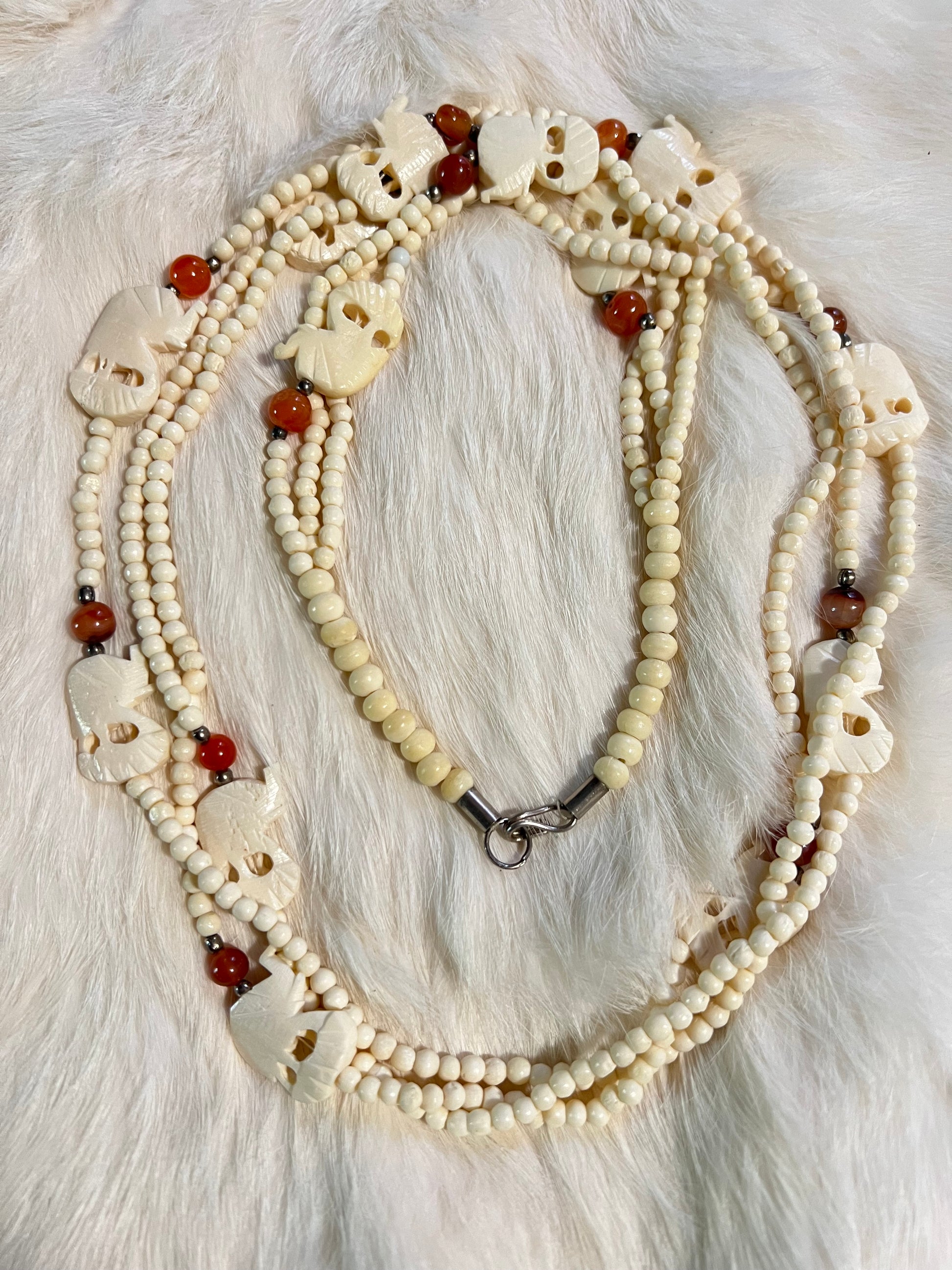 Carved bone elephant beads layered with carnelian and brass accents