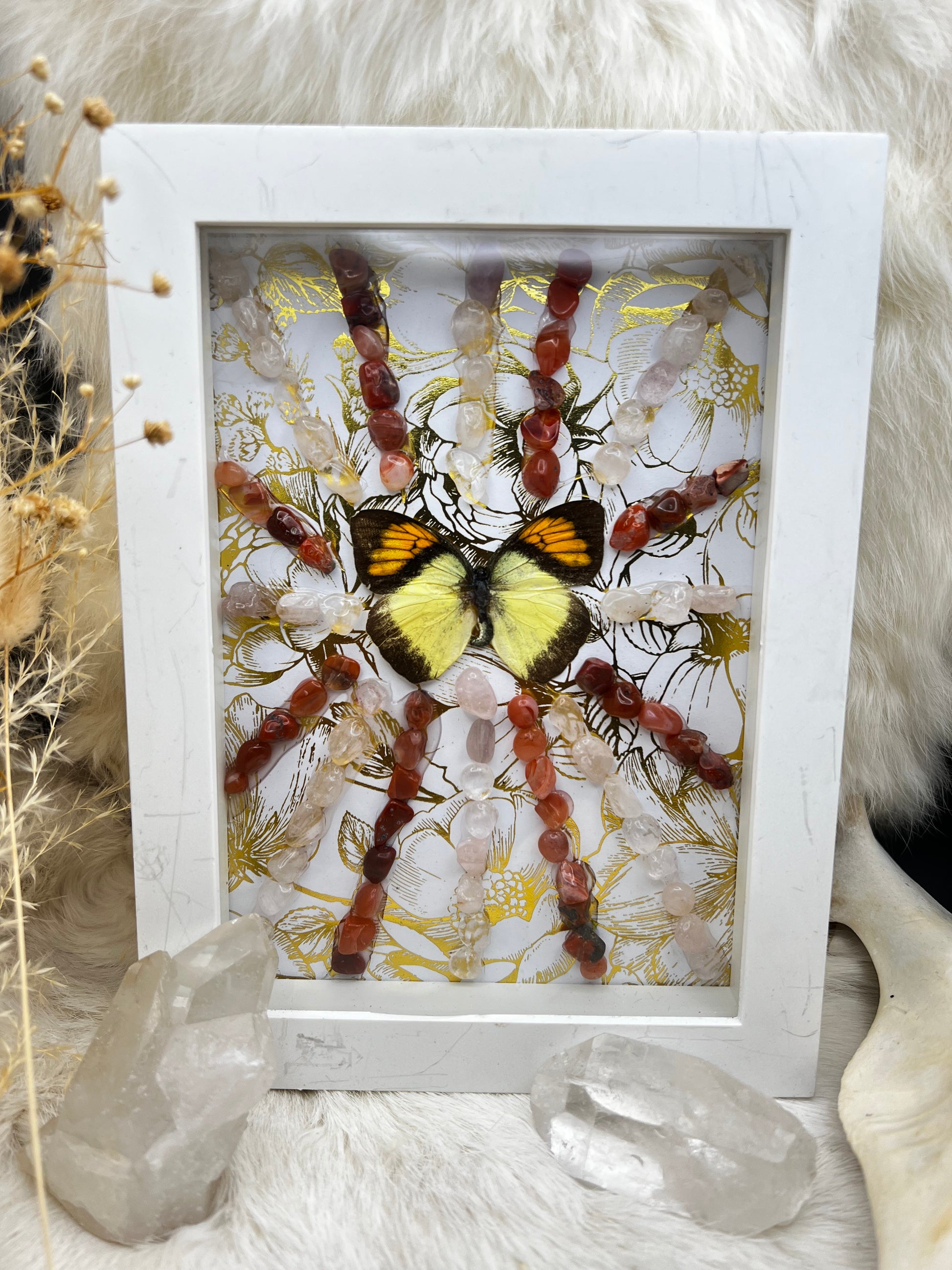Ixias pyrene, aka yellow orange tip Butterfly from a conservatory. Includes red jasper and rose quartz